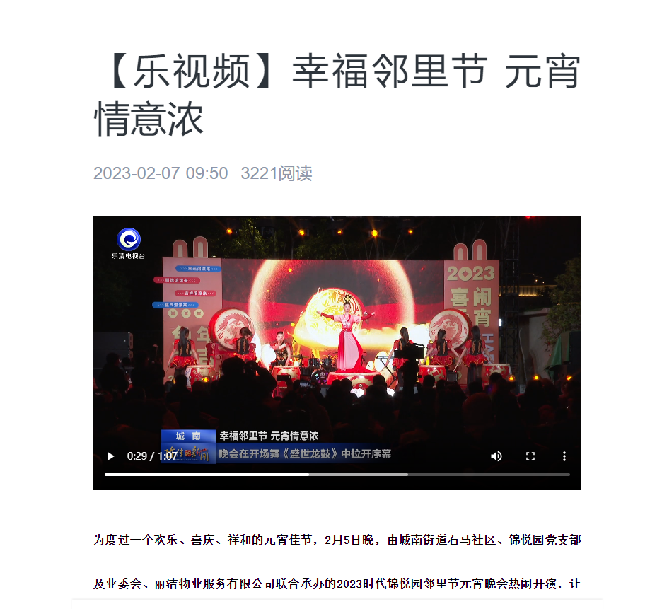 晚會通過線上線下方式同步直播,次日當(dāng)?shù)仉娨暸_《陳佳講新聞》欄目詳細報導(dǎo)了錦悅園元宵晚會盛況。