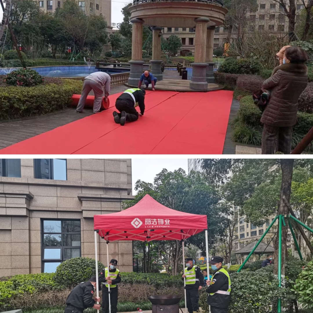 活動前,物業(yè)人員緊張的現(xiàn)場籌備工作